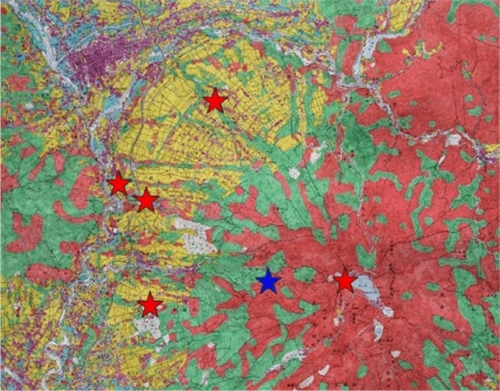 1987年にはついに最後に残された麓の落葉広葉樹林がゴルフ場に変わってしまいました。面であった落葉広葉樹林が線になり、ついに点になってしまい、こうなると若し数頭のヒメギフチョウが各点に残っていたとしても、それらは互いに交流が出来ずやがて死に絶える運命にあったでしょう。 1950年代の産地をもう一度地図上におとしてみました。青い星が最後の生息地です。当時の産地の上を関越自動車道が走っています。