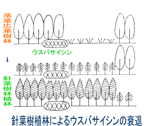 それでは、なぜ落葉広葉樹林が針葉樹林になるとヒメギフチョウが減少するのでしょうか。もうお分かりですね。先にも話しましたが、早春の落葉広葉樹林では林床まで日差しが届き、スプリングエフェメラルが沢山の花を咲かせます。ヒメギフチョウの食草ウスバサイシンも、そんな植物の一つです。落葉広葉樹林が針葉樹林になり、早春に十分な日差しを受けることが出来なくなると、元気がなくなってしまします。餌になるウスバサイシンが元気がなければ、ヒメギフチョウも衰退してしまいます。