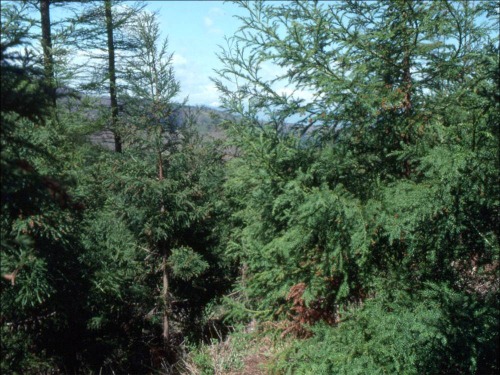 1997年にはもう、人の背丈を越えるほどになり、現在では数mの大きな木になっています。こうなると林床には、日の光は全く届かず、林床では貧弱なウスバサイシンしか見ることが出来ません。もちろん、ヒメギフチョウの飛翔は全く観察できません。