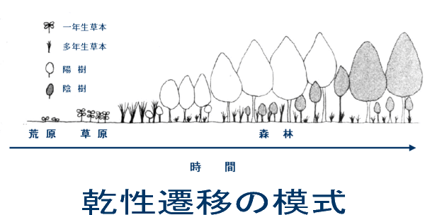 森林を手入れする人の数が減ると、せっかく残された落葉広葉樹林もあれてしまいます。関東地方の林は手入れしないで放置すると、だんだん、常緑広葉樹林に変化していきます。これを乾性遷移と言います。常緑広葉樹林は陰樹とよばれ、針葉樹林と同様に、一年中、林床に日が届かない林です。 落葉広葉樹林は、林を定期的に伐採することによって、その遷移の中間遷移の陽樹の段階を維持している林です。つまり、人間とのかかわりの中で存在してきた林と言えます。