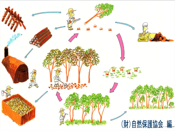 かつて、人々は落葉広葉樹林を生活の重要な場として利用していました。木材は炭にして、燃料にするほか、椎茸栽培の穂だぎとして、落ち葉は集めて保存することにより、堆肥として、また木の実は食料としたこともありました。その利用のため、数十年おきに伐採が行われ、落葉広葉樹林が維持されてきたのです。
