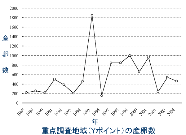 その内のひとつの産卵場所の産卵数の変化を1988年〜2004年まで見てみますしょう。各々年によって大きく変動するのが分かります。産卵できる場所を沢山増やし、各々の産卵場所の産卵数は、年ごとに変動しても、山全体としては一定した産卵数が観察できるように保護していかなくてはなりません。