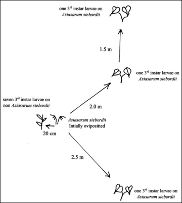 幼虫は3令になると、産卵された葉を離れて分散を開始します。どの位の距離を移動するか、調べてみました。遠い葉っぱでは3m以上離れたウスバサイシンに移動することもあります。ウスバサイシンが高密度になく、適当にはなれて自生していても、幼虫は十分に移動できると言うことのようです。これらさまざまな、基礎データが、以後の保全計画の策定に役立ちます。