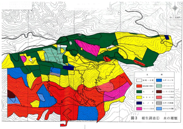 これが、木の種類です。山の尾根筋には落葉広葉樹林が、谷筋には針葉樹林が多く見られます。その間は落葉松の林になっています。