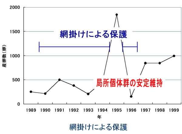 さて、それでは赤城山で具体的にとられた保護の手法をご紹介します。赤城山の場合は局所個体群も3箇所だけですので、まず、現存する局所個体群は安定した産卵数を維持しなくてはなりません。局所個体群は、そのサイズが小さくなると、消滅する可能性が高くなります。それを防ぐために若令幼虫の保護をして、死亡率を一時的に低く抑えること有効が有効でした。