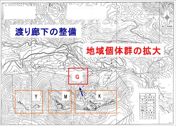 渡り廊下の整備は、局所個体群を新生し、地域個体群を拡大するのに有効でした。ヒメギフチョウは下草が高くなると、それを飛び越えることが少なく移動が阻害されます。 ここで示したG地域は下草の整理を行い、ウスバサイシンを埴栽して産卵環境の整備をした落葉松林です。この地域はさらに落葉松林を間伐し林の林床を明るくする作業が必要ですが、K地域で産卵しているチョウをG地域まで下ろしてくる道筋の整備も重要です。